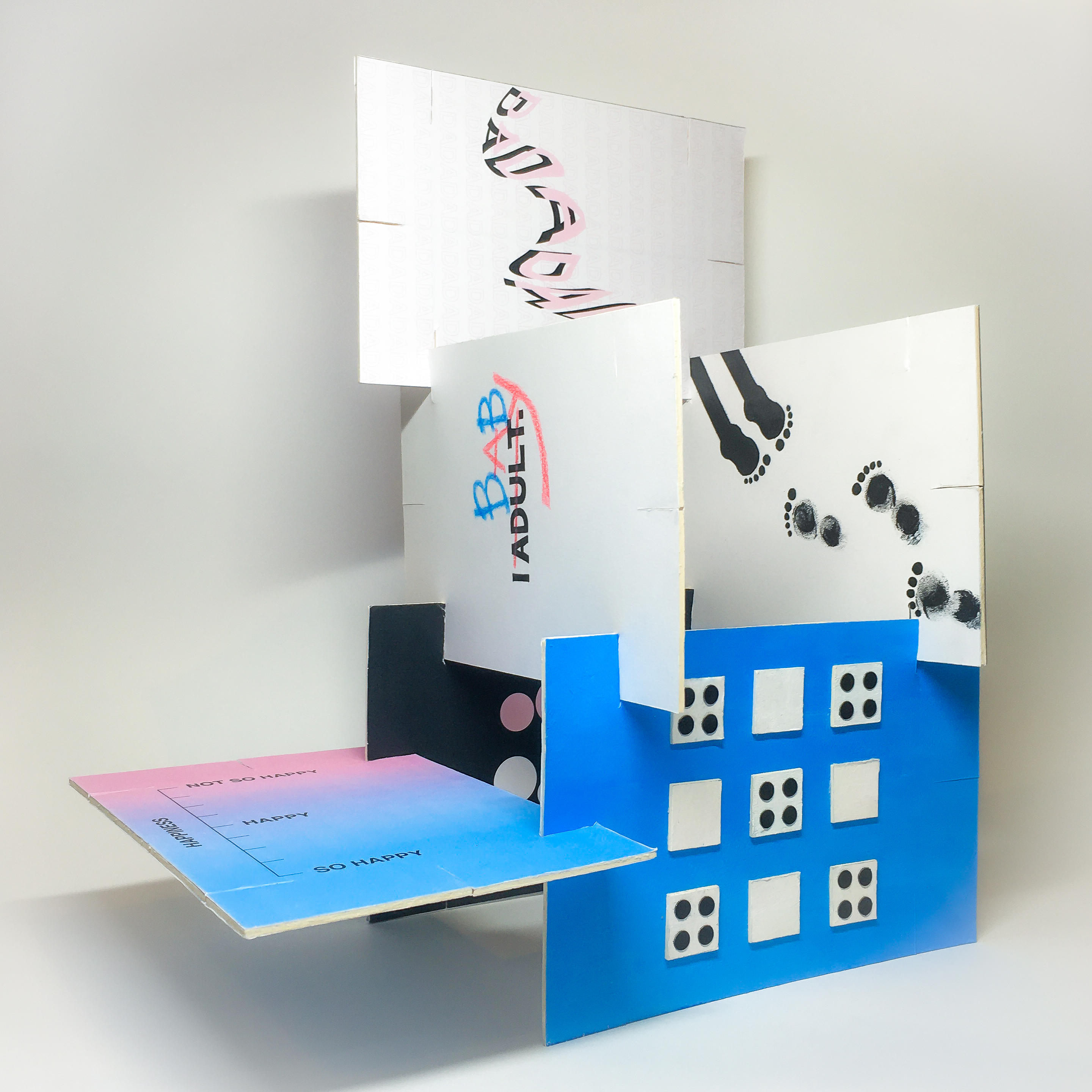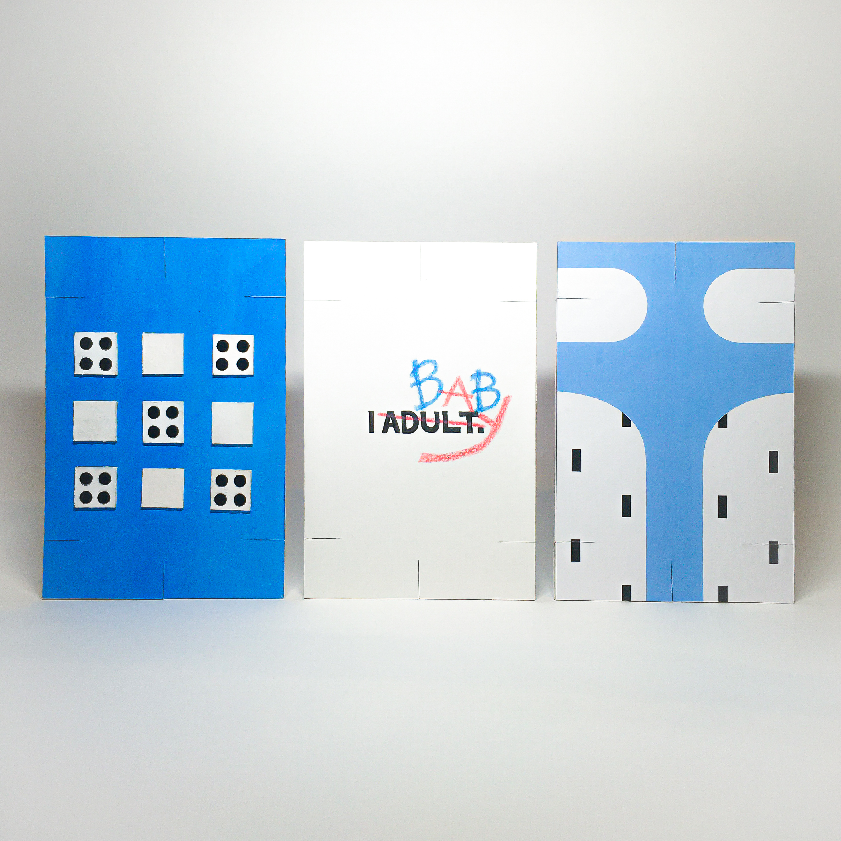 This project is my tribute towards the ABDL community (Adult Baby / Diaper Lover), through merging digital and traditional methods. They are those who enjoy the act of roleplay and find comfort using baby items. The final outcome are cards that can be stacked together.